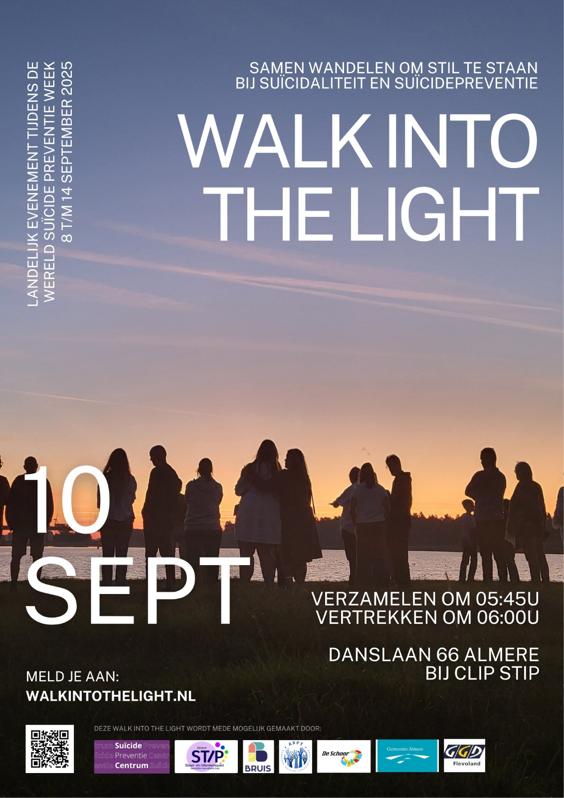 Op woensdag 10 september 2025 organiseren ASPT Almeerse Suicide Preventie Team, Clip Stip, de Schoor, NAH Forum, GGD Flevoland, Gemeente Almere, Eigenwijze Company en Betekenisvol Meedoen in samenwerking met Stichting Suïcide Preventie Centrum een Walk into the Light in Almere.